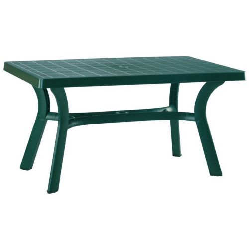 Sunrise Green 55 inches by 31 inches rectangle resin outdoor dining table. Made of high quality resin polypropylene. Extremely durable for outdoor conditions. Strong and stable legs. Perfect for pool, beach and heavy use areas. Resistant to suntan oils, chlorine and saltwater. Rectangle table has an umbrella hole and cap. Bottom piece is 14" high above the gorund for easy use with high umbrella bases.