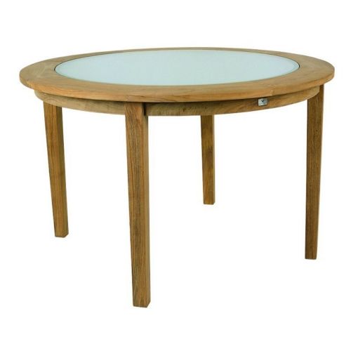 Kettal Aruba round outdoor dining table. Structure in top quality teak and anodized aliminum tubing. Resistant to outdoors. Aged teak with smooth feel. Table top in sanded glass.