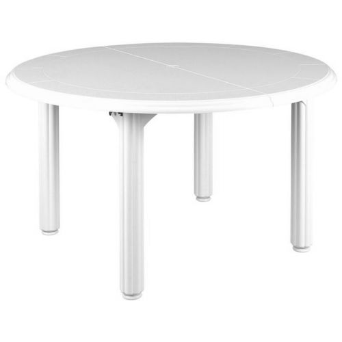 Triconfort Elysee round table with four legs. Lacquered resin round table accepts 2 leaf extensions. Resicream top. Extensions sold separately. Table has a hole for umbrella. Resistant to UV, chlorine, suntan oils, spills and stains. White lacquered resin.