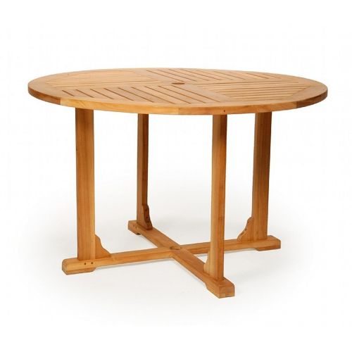 Modern teak round patio dining table. 48 inch diameter is perfect for 4 or 5 guests. Simple and elegant design. Made with kiln-dried, grade a teak wood. Teak wood is natural and suitable for outdoors. Requires regular teak wood maintenance. Great to use for patio dining arrangements. Easy assembly required. Dimensions: 48"D × 30"H. Table has standard umbrella hole.