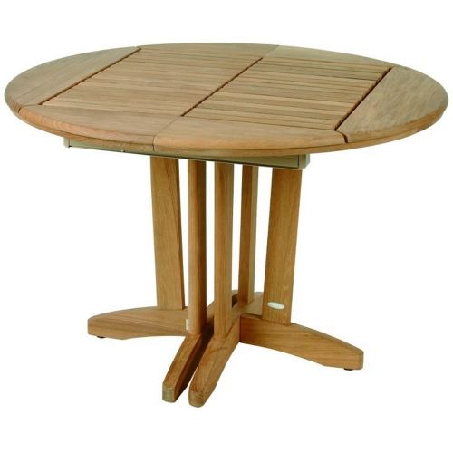 Triconfort Normandy natural teak round pedestal table with extension leaf and folding legs. For 6 to 10 guests. Top quality aged teak minimum age 120 years. Pores closed. Smooth natural feel. Teak wood comes from forests specially grown for production.