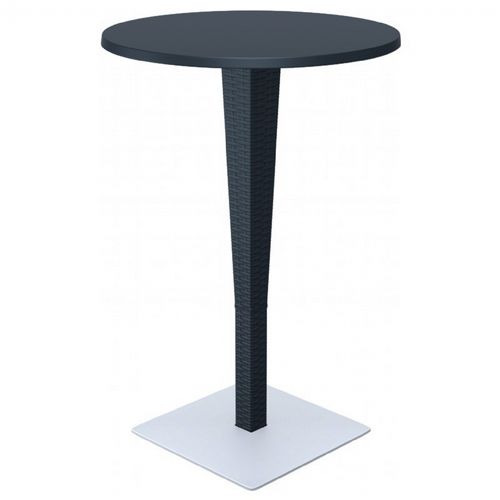 Riva round bar table with HPL compact laminated top, woven pedestal and aluminum base. Wickerlook resin is a natural looking un-woven furniture technology. Made for commercial durability. Perfect for hotels and restaurants. Hose down for cleaning. Withstands summer and winter outdoor temperatures. Made for outdoors. HPL compact laminated top is easy to clean. Round top. Dimensions: 28" Diameter × 42.5" H.