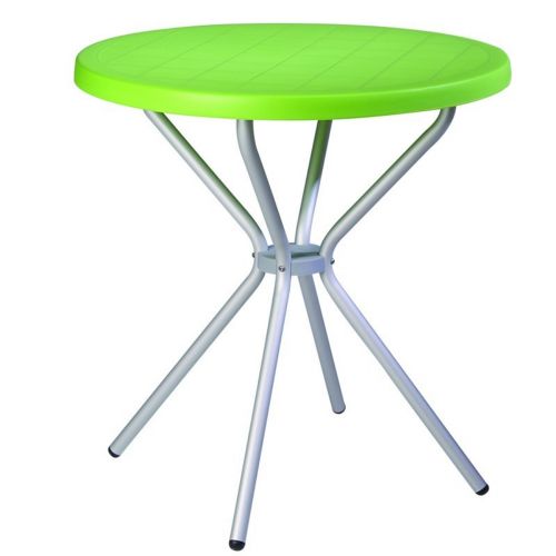 Round Outdoor Table from La Plaza Collection. Made from commercial grade resin with aluminum legs. Perfect for heavy use areas. Great for outdoor spaces, patios and decks. Used by restaurants, cafes and hotels. Legs are anodized aluminum. Color apple green. Top 28" Diameter.