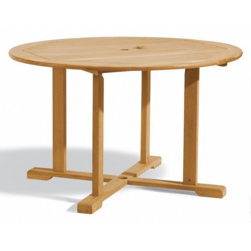 Outdoor round dining table from Oxford Garden. Slotted table top allows for water to pass through, preventing ponding. Table has a removable 1 and ⅝ inch plug to allow for an umbrella. Table leg joinery is wood to wood for a solid union. Handcrafted of shorea hard wood using mortise and tenon joinery shorea furniture will last for years to come. Shorea wood is tropical hardwood comparable to teak which is very resistant to water, sun and outdoor elements. Table matches all Oxford Garden furniture.