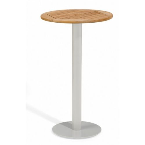 Travira Steel and Natural Tekwood Bar Table from Oxford Garden. Classic yet sleek look. Steel lightweight frames combined with teak wood top. Leg end caps provide protection from marring and scratching of surfaces. Durable steel powder coated frames resist weathering.