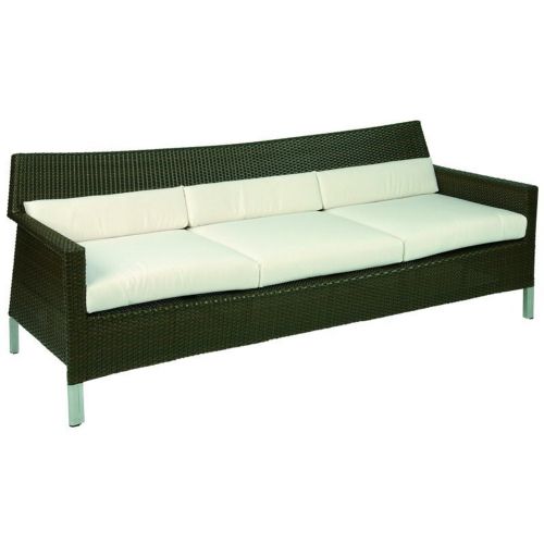 Biarritz three seater outdoor sofa from Triconfort. Made from synthetic outdoor wicker over aluminum tubing. Maintenance free. Modern outdoor furniture design. Can be washed down with water. Totally outdoor resistant. Cushions are made from Sunbrella fabric and durable for outdoor use. Cushions included. Sofa Dimensions: 30"D × 78"W × 31"H.