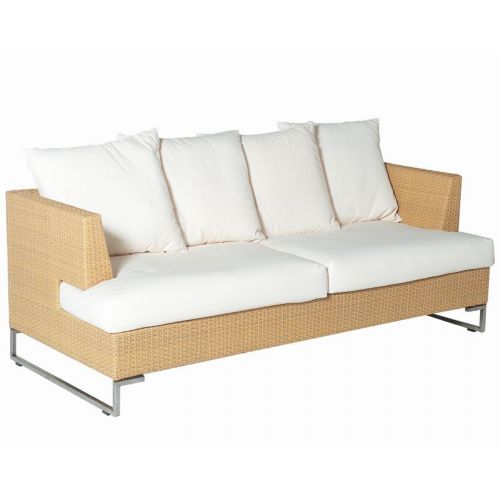 Luxor outdoor sofa. Structure in aluminum tubing, covered with synthetic wicker wowen to perfection. Synthetic wicker is similar to natural fibre but totally resistant to outdoors. Outdoor wicker available in white wisp, natural and dark brown. Seat and back cushions included.