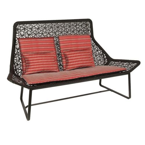 Maia two seater sofa from Ketal. Contemporary designer outdoor collection. Maia outdoor two seater sofa is a full aluminum frame with wicker weave. Modern and sleek design. Available in chestnut and white frames. Cushions available in designer fabrics. Cushion included.