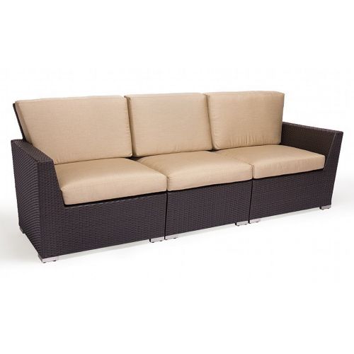 Maxime outdoor wicker deep club sofa from Caluco. Sofa includes one right sectional, one left sectional and one middle sectional modules. Bold geometric design. Plush and thick Sunbrella cushions. Made from Viro outdoor wicker over strong aluminum frames. Maintenance free. Can be washed down with water. Totally outdoor resistant. Viro outdoor wicker is handbraided and highly resistant to fading, cracking or mildew. Cushions are made from Sunbrella fabric and durable for outdoor use. Seat and back cushions included. Wicker available in Espresso only. Cushions are 4 inch thick.