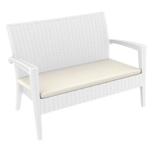 Miami white Wickerlook resin patio loveseat with cushion. Beautiful woven-wicker-looking resin loveseat. Wickerlook resin is a natural looking un-woven one piece furniture technology. Wickerlook patio furniture is made with open weave design that resembles traditional woven wicker furniture. Unlike any other woven furniture in the market Wickerlook outdoor furniture will never unravel. Made for commercial durability. Stackable. Perfect for hotels and restaurants. UV treated. Hose down for cleaning. Made for outdoors. Withstands outdoor temperatures summer and winter. Certified for strict European standards by CATAS Italian research institute and test laboratory.