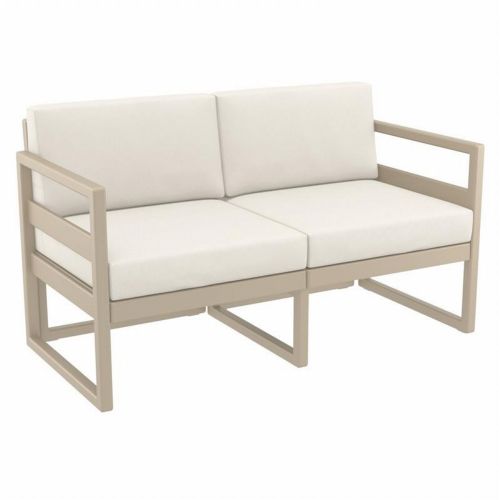 Mykonos resin outdoor loveseat with 100% acrylic natural cushions. Modular contemporary design with commercial strength. Made from commercial grade polypropylene resin. Mykonos loveseats are perfect for heavy use areas. Casual and modern design make it suitable for indoors and outdoors. Polypropylene frame resists sun, oils, chlorine and all outdoor conditions. Certified for strict European standards by CATAS Italian research institute and test laboratory.