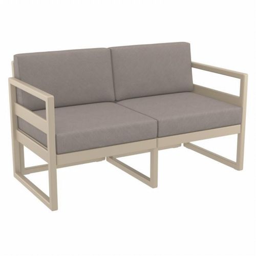 Mykonos resin outdoor loveseat with 100% acrylic taupe cushions. Modular contemporary design with commercial strength. Made from commercial grade polypropylene resin. Mykonos loveseats are perfect for heavy use areas. Casual and modern design make it suitable for indoors and outdoors. Polypropylene frame resists sun, oils, chlorine and all outdoor conditions. Certified for strict European standards by CATAS Italian research institute and test laboratory.