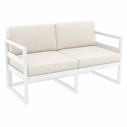 Mykonos resin outdoor loveseat with 100% acrylic natural cushions. Modular contemporary design with commercial strength. Made from commercial grade polypropylene resin. Mykonos loveseats are perfect for heavy use areas. Casual and modern design make it suitable for indoors and outdoors. Polypropylene frame resists sun, oils, chlorine and all outdoor conditions. Certified for strict European standards by CATAS Italian research institute and test laboratory.