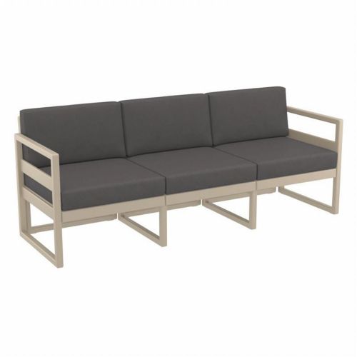 Mykonos resin outdoor sofa with 100% acrylic charcoal cushions. Modular contemporary design with commercial strength. Made from commercial grade polypropylene resin. Mykonos Sofas are perfect for heavy use areas. Casual and modern design make it suitable for indoors and outdoors. Polypropylene frame resists sun, oils, chlorine and all outdoor conditions. Certified for strict European standards by CATAS Italian research institute and test laboratory.
