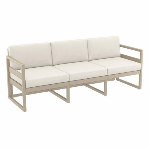 Mykonos resin outdoor sofa with 100% acrylic natural cushions. Modular contemporary design with commercial strength. Made from commercial grade polypropylene resin. Mykonos sofas are perfect for heavy use areas. Casual and modern design make it suitable for indoors and outdoors. Polypropylene frame resists sun, oils, chlorine and all outdoor conditions. Certified for strict European standards by CATAS Italian research institute and test laboratory.