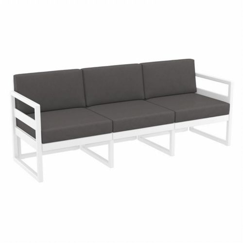 Mykonos white resin outdoor sofa with 100% acrylic charcoal cushions. Modular contemporary design with commercial strength. Made from commercial grade polypropylene resin. Mykonos sofas are perfect for heavy use areas. Casual and modern design make it suitable for indoors and outdoors. Polypropylene frame resists sun, oils, chlorine and all outdoor conditions. Certified for strict European standards by CATAS Italian research institute and test laboratory.