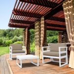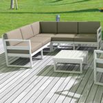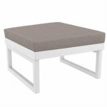 Mykonos white resin outdoor sofa with 100% acrylic taupe cushions. Modular contemporary design with commercial strength. Made from commercial grade polypropylene resin. Mykonos Sofas are perfect for heavy use areas. Casual and modern design make it suitable for indoors and outdoors. Polypropylene frame resists sun, oils, chlorine and all outdoor conditions. Certified for strict European standards by CATAS Italian research institute and test laboratory.