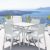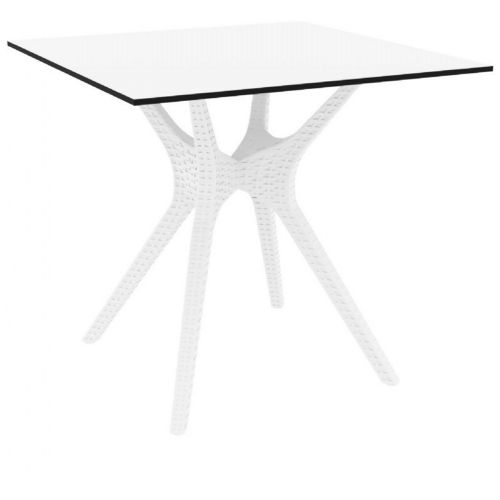 Ibiza contemporary dining table 31 inches square with wickerlook legs. HPL compact laminated top with the latest generation of air moulding thermoplastic legs that looks like woven wicker. For indoor and outdoor use. Can be disassembled. Modern sleek design. Easy to clean.