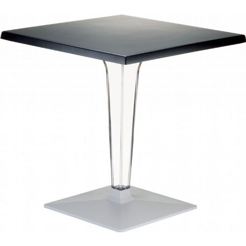 Ice square dining table with HPL compact laminated top and clear polycarbonate pedestal and aluminum base. Table is made for commercial durability. Suitable for indoor or outdoor use. Perfect for hotels and restaurants. UV treated. Hose down for cleaning. Withstands summer and winter outdoor temperatures. Made for outdoors. HPL compact laminated top is easy to clean. Polycarbonate pedestal is elegant and classy. Square top. Dimensions: 23.6" W × 23.6" L × 29" H.