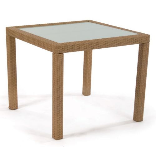 Marbella 36 inch square outdoor wicker dining table from Kannoa. Features sturdy aluminum frames covered with flat all weather wicker. Resistant to harsh outdoor conditions. Outdoor wicker is sleek and modern. Great choice for garden and patio dining. Wicker available in espresso and white wicker. Table top is white glass.