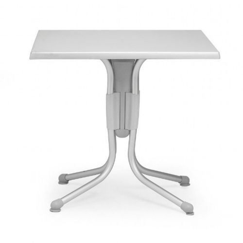 Polo commercial grade square outdoor folding table with silver gray HPL compact laminated top and anodized aluminum legs. Polo table has a very unique folding system. Very strong and sturdy. Perfect for cafes, restaurants, hotels. Table top in commercial grade HPL compact laminated. Legs in anodised aluminum. Table top in silver gray. Pedestal has an accent in silver gray.