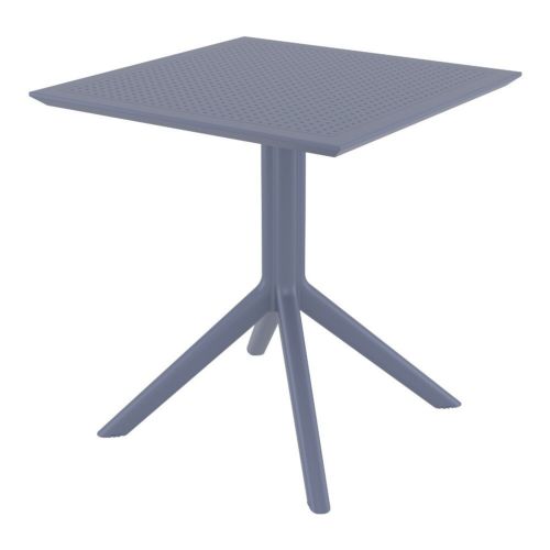 Sky resin outdoor dining table with 27.5 inch square top. Both top and body are made of high quality resin with concealed metals for a heavier more stable posture. Table top has pinholes that helps with rainwater drainage and creates a modern look. Extremely durable for outdoor environments. Table is perfect for balcony, pool, beach and heavy use areas. Resistant to suntan oils, chlorine and saltwater. UV protected. For indoor and outdoor use.