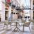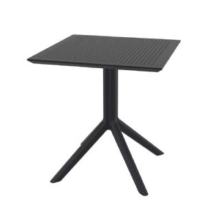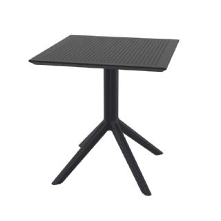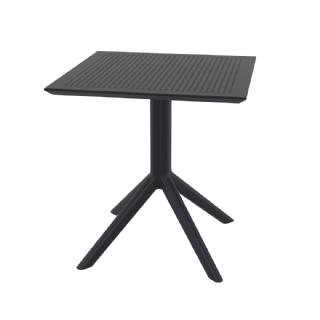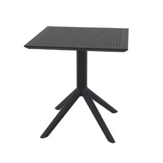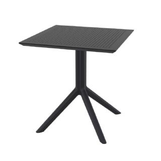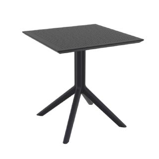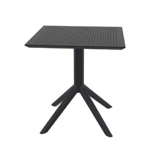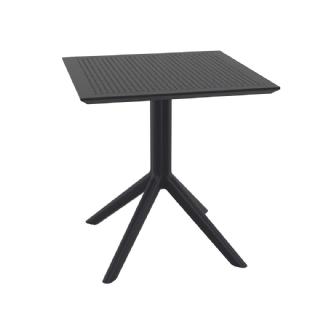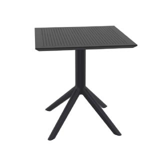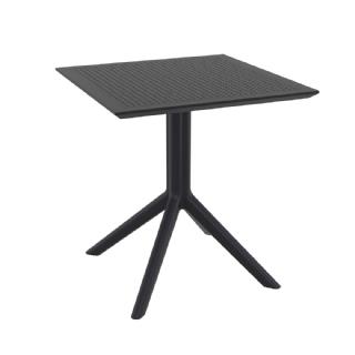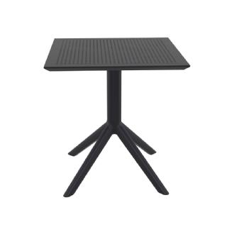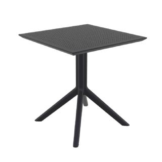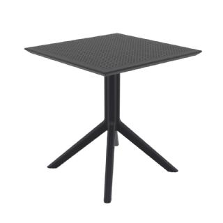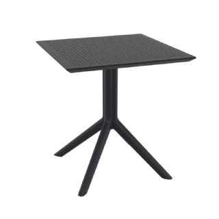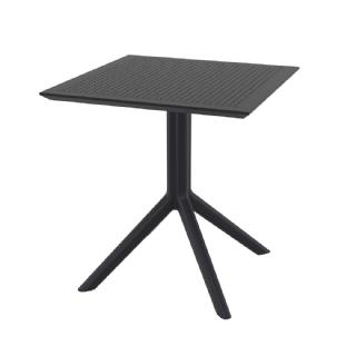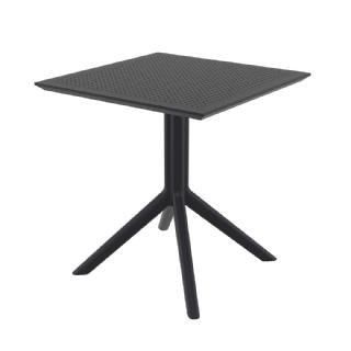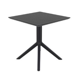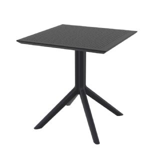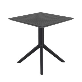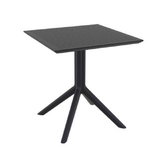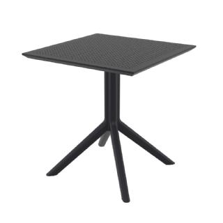 Sky resin outdoor dining table with 27.5 inch square top. Both top and body are made of high quality resin with concealed metals for a heavier more stable posture. Table top has pinholes that helps with rainwater drainage and creates a modern look. Extremely durable for outdoor environments. Table is perfect for balcony, pool, beach and heavy use areas. Resistant to suntan oils, chlorine and saltwater. UV protected. For indoor and outdoor use.