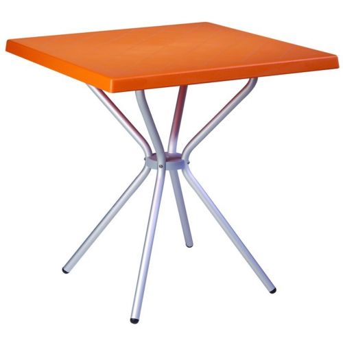 Square Outdoor Table from La Plaza Collection. Made from commercial grade resin with aluminum legs. Perfect for heavy use areas. Great for outdoor spaces, patios and decks. Used by restaurants, cafes and hotels. Legs are anodized aluminum. Color orange. Top 28" × 28".