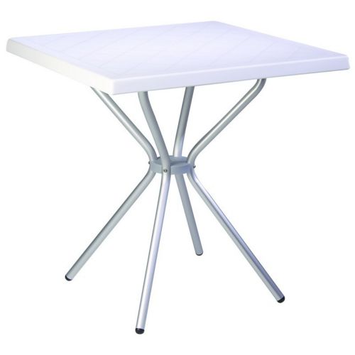 Square Outdoor Table from La Plaza Collection. Made from commercial grade resin with aluminum legs. Perfect for heavy use areas. Great for outdoor spaces, patios and decks. Used by restaurants, cafes and hotels. Legs are anodized aluminum. Color white. Top 28" × 28".