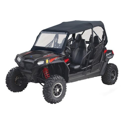 UTV Roll Cage Top with Front & Rear Windows for Polaris RZR 4. Provides heavy-duty protection from weather conditions with heavy-duty ProtekX™ Extreme fabric. Fits over the UTV roll cage to protect against rain, snow, sun and wind. Large ultra-clear windshield material and back window for excellent visibility. Mounts to the roll cage with rip-and-grip closure tabs and self-adhesive tape strips. Windshield easily detaches for no windshield option. Rear window unzips, rolls down and secures with rip-and-grip straps.
