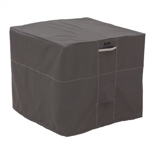 Ravenna Air Conditioner Square Cover. The Ravenna covers from Classic Accessories combine a striking style with durability, fade-resistance and convenient features. It reinforced padded handles make removal easy while double-stitched seams add strength and a stylish accent. Structured vents stay open to prevent wind lofting and mildew and are lined with mesh barriers. Laminate backing keeps your grill dry while elastic hem cords move easily through a special channel for a snug fit. Four custom-colored buckles keep your cover secure in any weather. Adjustable webbing belts slide easily for a tailored look. Striped webbing adds an attractive accent and is unique to the Ravenna collection.