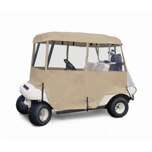 Deluxe 4-Sided Golf Car Four-person Enclosure fits over roof-just roll down sides when bad weather threatens. Keeps golf cars clean and dry in storage. Super-clear PVC windows with heavy-duty vinyl doors and top. Installs in minutes without tools. Roof valance covers rolled up panels. Six zip-open panels roll up and down independently for quick and easy adjustment to any weather condition. Carrying case included. 3 year manufacturers warranty.