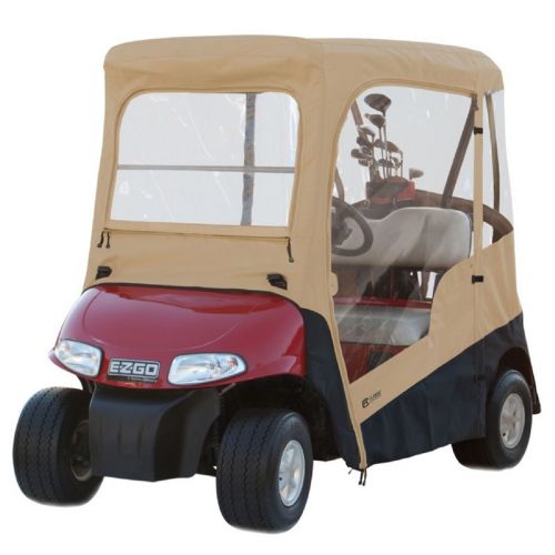 Fairway E-Z-Go Golf Cart Enclosure. This enclosure offers a custom fit for the Yamaha Drive two-person golf carts. It boasts full protection against weather and wind, and will keep golf cars clean and dry in storage as well. Constructed with heavy-duty polyester walls and top, this durable enclosure features super-clear window material so your line of sight isn't disrupted. Zippered doors and panels adjust quickly and easily to any weather condition, with a quick zip-off windshield that stores in the front pocket. The enclosure secures with hooks on the bottom.