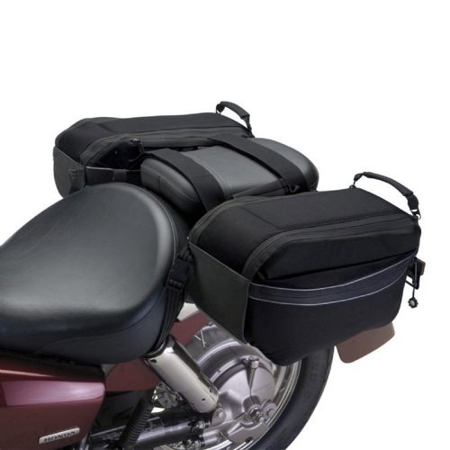 Motorcycle Saddle Bags Black. Rugged, universal fit saddle bag cargo system. Heavy-duty ProtekX™ Extreme fabric. Dual saddle bags attach quickly with adjustable rubberized straps and quick-release buckles. Heat shield panels on the bottom and sides protect against hot exhaust. Foam panels provide structure and protect gear. Big zippered cargo compartments with easy-open handles. High-visibility pull-out storm shield. Reflective trim. Exterior zippered side pockets.