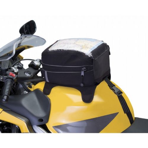 Motorcycle Tank Bag Black. Expandable cargo bag for sport and other bikes. Heavy-duty ProtekX™ Extreme fabric. Expandable zippered cargo compartment. Scratch resistant, non-slip bottom. Foam panels provide structure and protect gear. Magnets attach bag to fuel tank. Ultra-clear map pocket for easy viewing. High-visibility pull-out storm shield. Reflective trim.