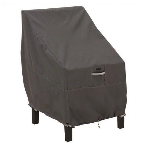 Ravenna Highback Chair Cover. The Ravenna covers from Classic Accessories combine a striking style with durability, fade-resistance and convenient features. It reinforced padded handles make removal easy while double-stitched seams add strength and a stylish accent. Structured vents stay open to prevent wind lofting and mildew and are lined with mesh barriers. Laminate backing keeps your grill dry while elastic hem cords move easily through a special channel for a snug fit. Four custom-colored buckles keep your cover secure in any weather. Adjustable webbing belts slide easily for a tailored look. Striped webbing adds an attractive accent and is unique to the Ravenna collection.
