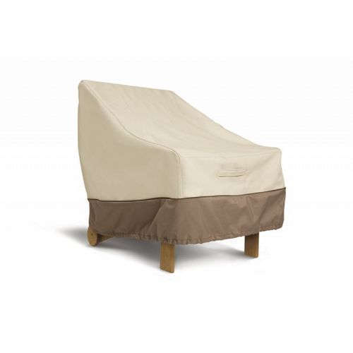 Veranda Adirondack Chair Cover Gardelle™ protective fabric system features an elegant fabric top with a water repellent and resistant PVC under-coating and a protective splash guard skirt. Tough interlocking seams add strength and durability. Special treatments ensure fabric won't crack in cold weather. Click-close straps snap over legs to secure cover on windy days. Air vent reduces inside condensation and wind lofting. Padded handles for easy fitting and removal. Elastic hem cord with a toggle allows adjustment for a tight and custom fit. 3 year manufacturers warranty