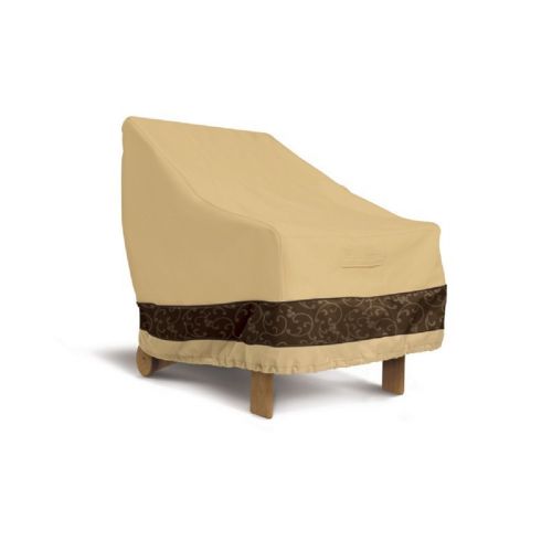 Veranda Elite patio chair cover. Protective Gardelle fabric system features an elegant fabric top with a water repellent and resistant PVC under-coating and a protective splash guard skirt. Debossed fabric pattern. Tough interlocking seams add strength and durability. Special treatments ensure fabric won't crack in cold weather. Click-close straps snap over legs to secure cover on windy days. Air vent reduces inside condensation and wind lofting. Padded handles for easy fitting and removal. Elastic hem cord with a toggle allows adjustment for a tight and custom fit. 3 year manufacturers warranty.
