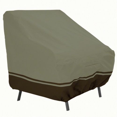 Villa Chair Cover High Back. Light but weather-resistant, our WeatherPro™ 3-ply polypropylene fabric provides an attractive line of covers at a surprising price while protecting against rain, snow, sun and dirt. It is PVC free and solution dyed for exceptional fade resistance. Air vents reduce inside condensation and wind lofting and straps tie around the legs to so the cover stays secure on windy days. Elastic corners provide a fast and secure fit, and it comes equipped with handles for easy fitting and removal.