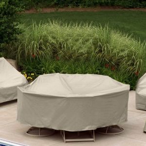 30" to 36" round bistro table with 2 standard chairs patio furniture set cover. Features a smart Velcro fastening system which ties the cover to the tables and chairs with velcro brackets . Patio furniture winter covers are totally waterproof and have been UV treated to last years outdoors. Vinyl is soft and rich to the touch and will add luxury to your patio while protecting your furniture investment. Use them under Rain, Snow, Hot Summer sun or Harsh Winters with sub zero temperatures. This product is a winter storage cover and does not have a hole for umbrella. Dimensions: 54" diameter w/30" drop. All patio furniture covers have 3 Years Manufacturer's Warranty.