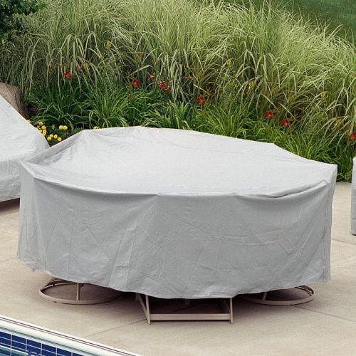 60" to 66" oval or rectangular table with 6 highback chairs patio furniture set cover. Ideal for winter storage. Features a smart Velcro fastening system. Patio furniture set covers are totally waterproof and have been UV treated to last years outdoors. Vinyl is soft and rich to the touch and will add luxury to your patio while protecting your furniture investment. This product is a winter storage cover and do not have a hole for umbrella. Dimensions: 108" × 80" w/30" drop. 3 Years Manufacturer's Warranty.