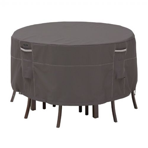 Ravenna Patio Table and Chair Bistro Cover. The Ravenna covers from Classic Accessories combine a striking style with durability, fade-resistance and convenient features. It reinforced padded handles make removal easy while double-stitched seams add strength and a stylish accent. Structured vents stay open to prevent wind lofting and mildew and are lined with mesh barriers. Laminate backing keeps your grill dry while elastic hem cords move easily through a special channel for a snug fit. Four custom-colored buckles keep your cover secure in any weather. Adjustable webbing belts slide easily for a tailored look. Striped webbing adds an attractive accent and is unique to the Ravenna collection.
