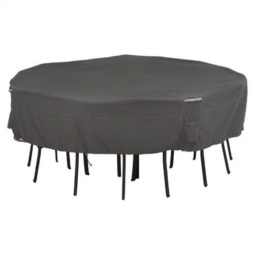 Ravenna Table and Chair Square Cover Large. The Ravenna covers from Classic Accessories combine a striking style with durability, fade-resistance and convenient features. It reinforced padded handles make removal easy while double-stitched seams add strength and a stylish accent. Structured vents stay open to prevent wind lofting and mildew and are lined with mesh barriers. Laminate backing keeps your grill dry while elastic hem cords move easily through a special channel for a snug fit. Four custom-colored buckles keep your cover secure in any weather. Adjustable webbing belts slide easily for a tailored look. Striped webbing adds an attractive accent and is unique to the Ravenna collection.