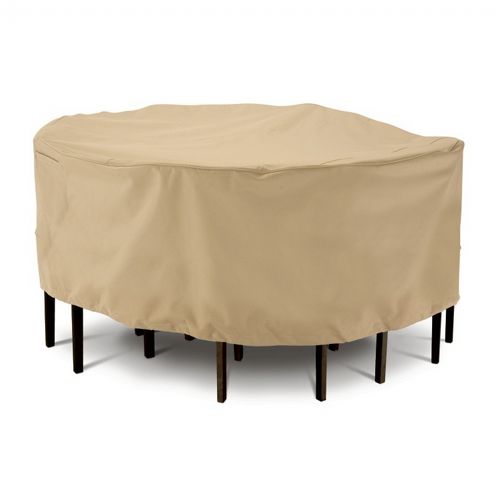 Terrazzo Patio Table and Chair Large Set Cover. Fits large round tables and chairs as a set. Chair back to chair back diameter is 94 inches. Rain-Tite™ fabric protects against rain, snow, sun and dirt, and won't crack in cold weather. Air vents reduce inside condensation and wind lofting. StayOn™ elastic loops fit over legs to keep cover on during high winds and breezy conditions. Elastic cord in bottom hem for a fast and custom fit. One year manufacturers warranty.