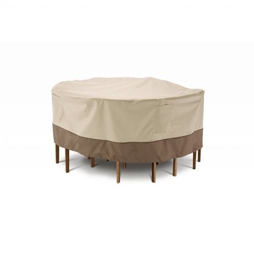 Veranda Patio Bistro Table and Chair Set Cover Gardelle™ protective fabric system features an elegant fabric top with a water repellent and resistant PVC under-coating and a protective splash guard skirt. Tough interlocking seams add strength and durability. Special treatments ensure fabric won't crack in cold weather. Click-close straps snap over legs to secure cover on windy days. Air vents reduce inside condensation and wind lofting. Padded handles for easy fitting and removal