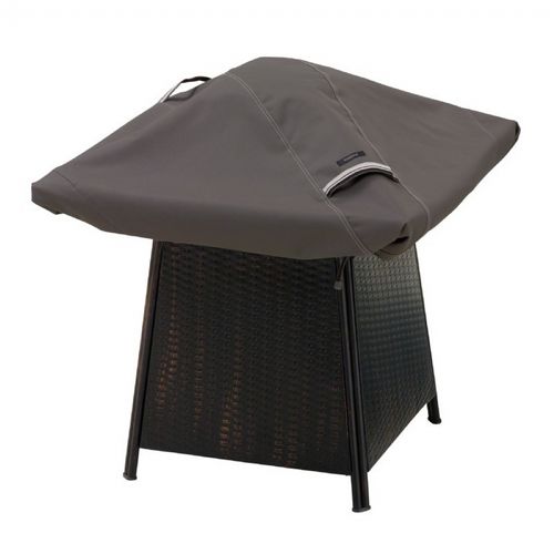 Ravenna Square Fire Pit Cover. The Ravenna covers from Classic Accessories combine a striking style with durability, fade-resistance and convenient features. It reinforced padded handles make removal easy while double-stitched seams add strength and a stylish accent. Structured vents stay open to prevent wind lofting and mildew and are lined with mesh barriers. Laminate backing keeps your grill dry while elastic hem cords move easily through a special channel for a snug fit. Four custom-colored buckles keep your cover secure in any weather. Adjustable webbing belts slide easily for a tailored look. Striped webbing adds an attractive accent and is unique to the Ravenna collection.