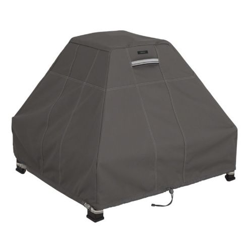Ravenna Stand Up Fire Pit Cover. The Ravenna covers from Classic Accessories combine a striking style with durability, fade-resistance and convenient features. It reinforced padded handles make removal easy while double-stitched seams add strength and a stylish accent. Structured vents stay open to prevent wind lofting and mildew and are lined with mesh barriers. Laminate backing keeps your grill dry while elastic hem cords move easily through a special channel for a snug fit. Four custom-colored buckles keep your cover secure in any weather. Adjustable webbing belts slide easily for a tailored look. Striped webbing adds an attractive accent and is unique to the Ravenna collection.