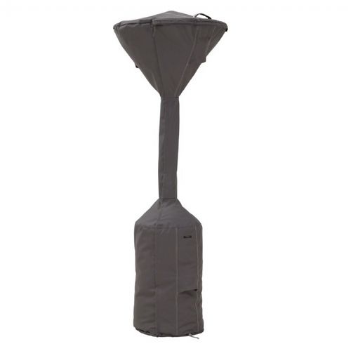 Ravenna Stand Up Patio Heater Cover. The Ravenna covers from Classic Accessories combine a striking style with durability, fade-resistance and convenient features. It reinforced padded handles make removal easy while double-stitched seams add strength and a stylish accent. Structured vents stay open to prevent wind lofting and mildew and are lined with mesh barriers. Laminate backing keeps your grill dry while elastic hem cords move easily through a special channel for a snug fit. Four custom-colored buckles keep your cover secure in any weather. Adjustable webbing belts slide easily for a tailored look. Striped webbing adds an attractive accent and is unique to the Ravenna collection.