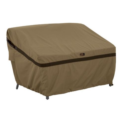 Hickory Sofa Loveseat Cover Large. The Hickory Series from Classic Accessories offers rugged good looks while providing years of weather protection. Weather10™ fabric features a rugged outer layer with a protective water-repellent and wipe-clean PVC undercoating. Its heavy-duty fabric and tough interlocking seams add strength and durability while the air vents reduce condensation and wind lofting. With so many great features, such as padded handles, adjustable elastic hem cord, and click-close straps that keep your cover secure on windy days, this cover proves to be convenient and dependable as well as stylish.