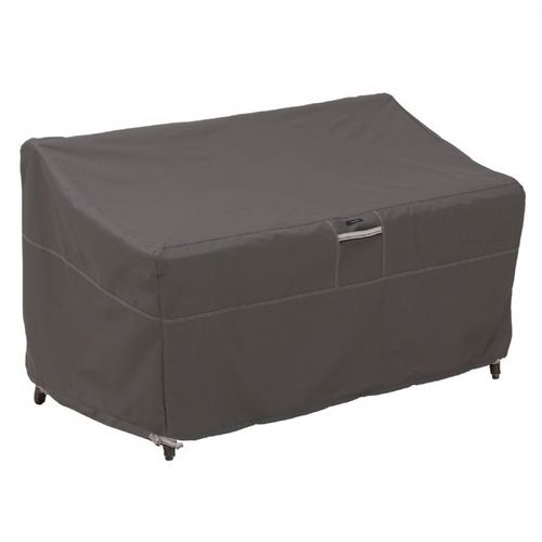 Ravenna Sofa Loveseat Cover Small. The Ravenna covers from Classic Accessories combine a striking style with durability, fade-resistance and convenient features. It reinforced padded handles make removal easy while double-stitched seams add strength and a stylish accent. Structured vents stay open to prevent wind lofting and mildew and are lined with mesh barriers. Laminate backing keeps your grill dry while elastic hem cords move easily through a special channel for a snug fit. Four custom-colored buckles keep your cover secure in any weather. Adjustable webbing belts slide easily for a tailored look. Striped webbing adds an attractive accent and is unique to the Ravenna collection.